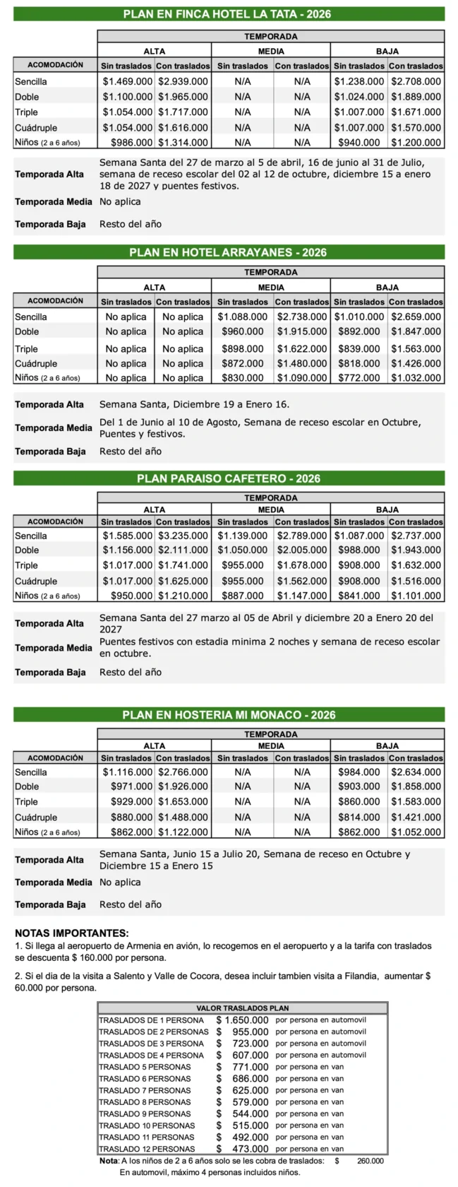• Tarifas por persona plan turístico eje cafetero. La tarifa de niños aplica en compañía de mínimo 2 adultos.