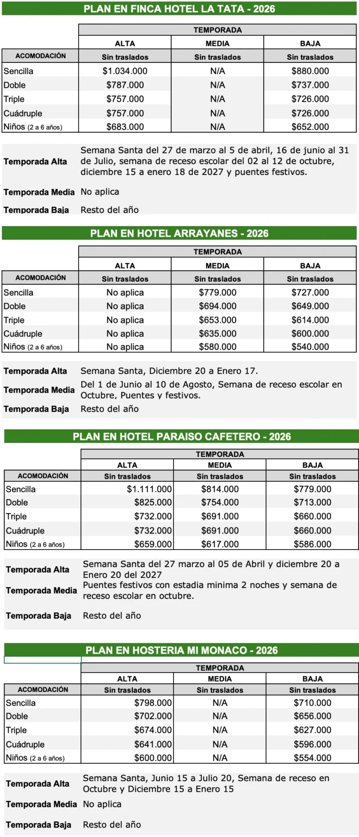 El Plan Quindio TOTAL 3 dias / 2 noches con 2 atractivos turísticos, ha sido diseñado para aquellas personas que quieren disfrutar el Eje Cafetero al mejor precio posible, alojándose en una tradicional finca cafetera, de muy fácil acceso en vehículo privado o público.