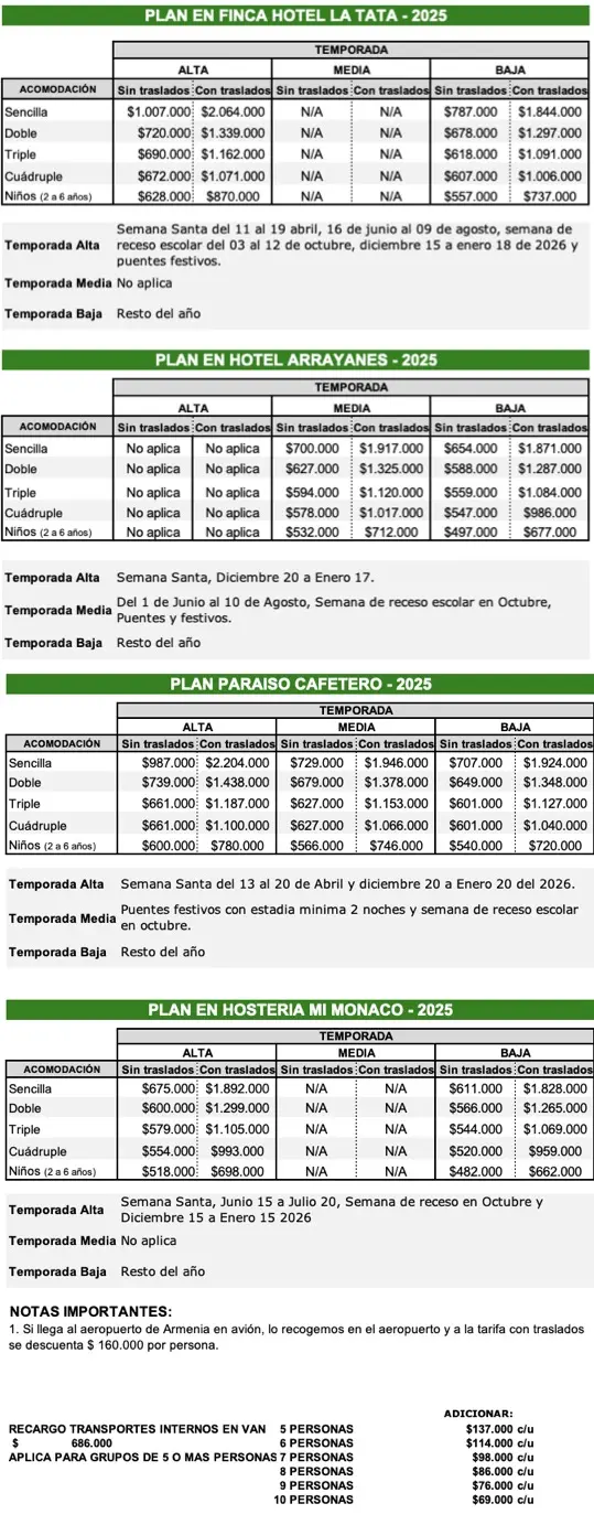 5:00 pm Traslado desde el Parque del Café al terminal de transportes de Armenia, para tomar el bus de regreso hacia la ciudad de origen. Fin de nuestros servicios.