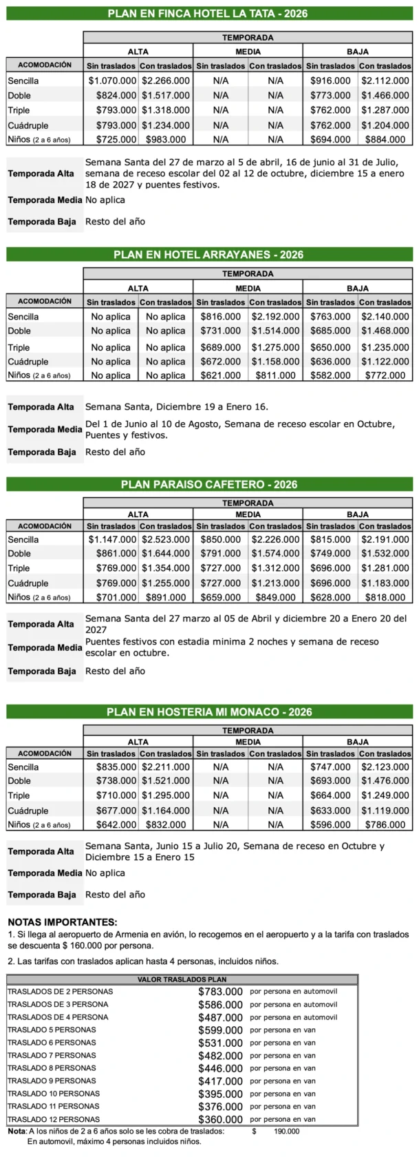 El Plan Parque del Café 3 dias / 2 noches con o sin transporte desde Bogotá (Cali Medellin o Ibagué), ha sido diseñado para aquellas personas que quieren visitar el Eje Cafetero y sus 3 principales atractivos turísticos, pero no cuentan con mucho tiempo para su visita, convirtiendos en un plan al eje cafetero muy completo para tan pocos dias.