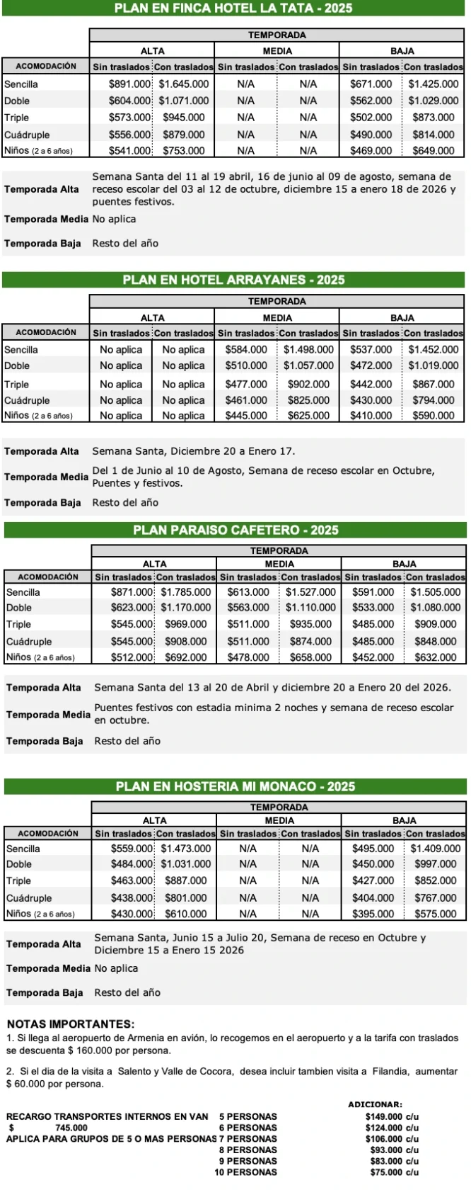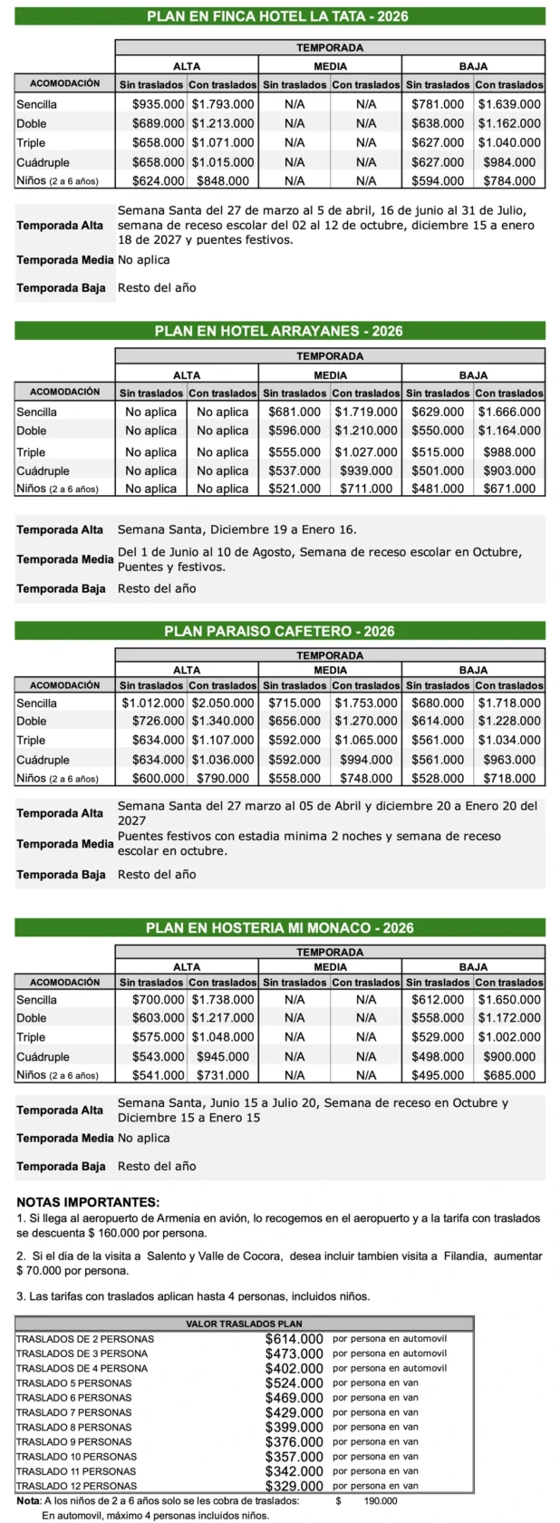 Dia 1: En las primeras horas de la mañana, recibimiento en el Terminal de Transportes de Armenia. Dejaremos las maletas en el Hotel, y de inmediato nos dirigimos hacia el Parque del Café. Visita al Parque del Café. Incluye el pasaporte múltiple (todas las atracciones y shows – Excepto el paseo a caballo $ 12,000 por persona). En la noche nos trasladamos al Hotel, y disfrutaremos de una deliciosa cena.