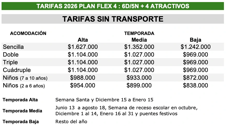 • Tarifas por persona. La tarifa de niños aplica en compañía de mínimo 2 adultos.
