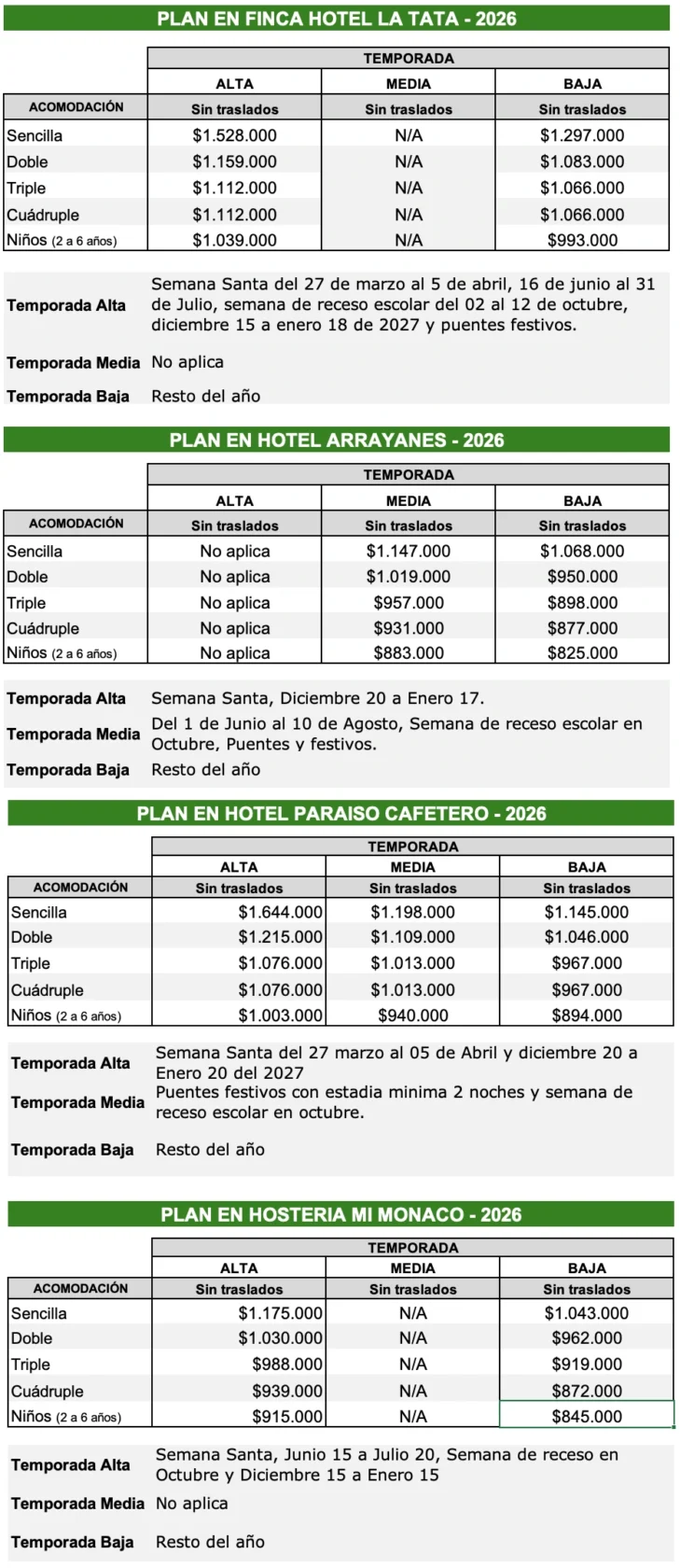 El Plan EJE CAFETERO FLEX PLUS 3: 4 dias / 3 noches con 3 atractivos turísticos, ha sido diseñado para aquellas personas que quieren disfrutar el Eje Cafetero al mejor precio posible, alojándose en una tradicional finca cafetera, de muy fácil acceso en vehículo privado o público.